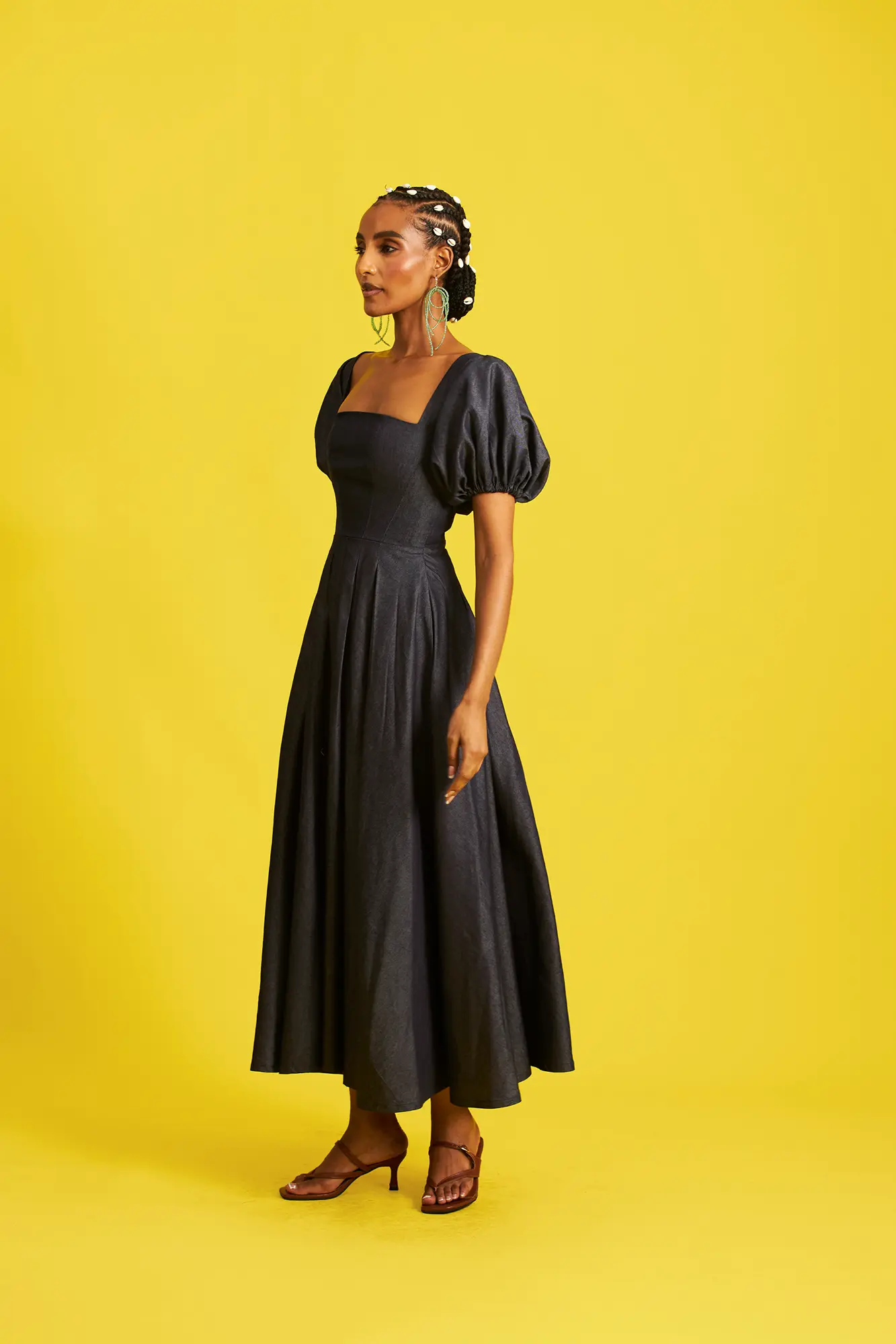 Midi dress with puffy sleeves and sqaure neckline