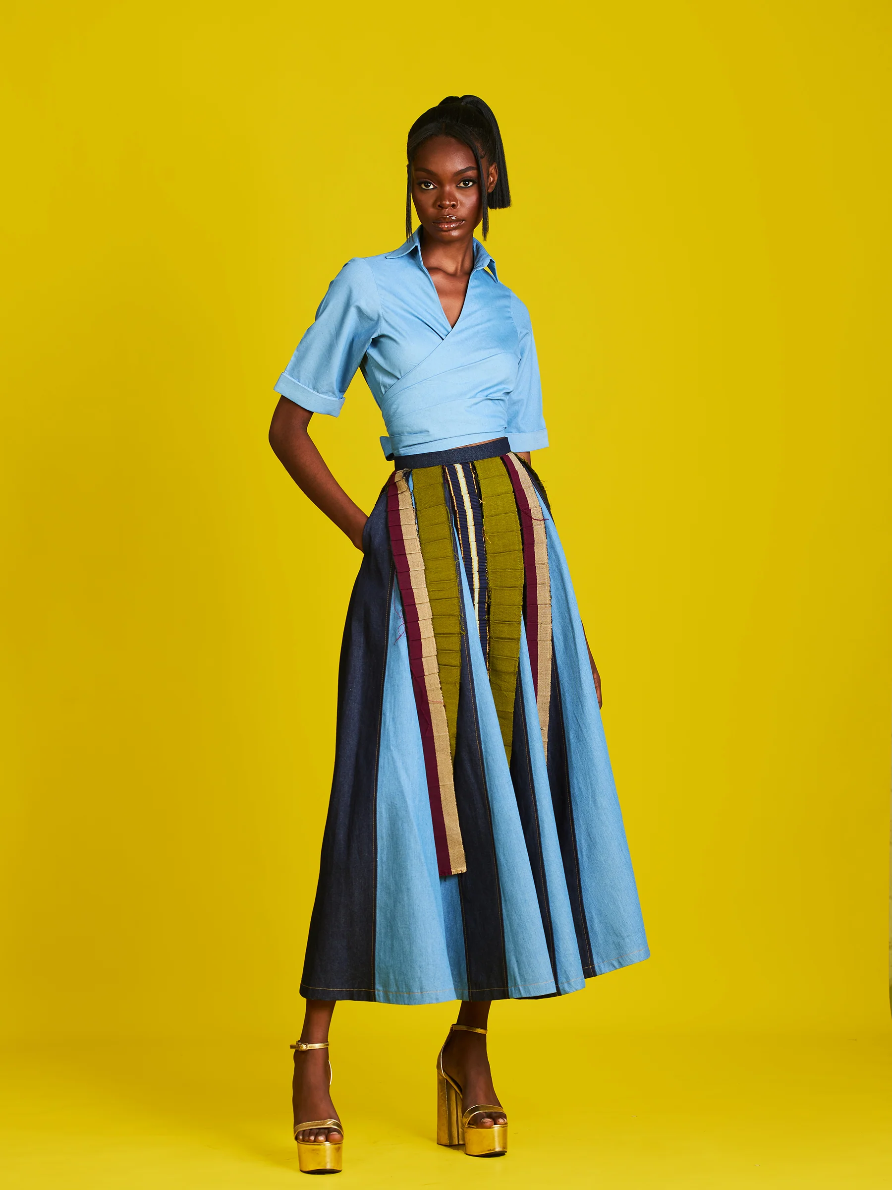 Aso oke and denim fringe belt with frayed edges