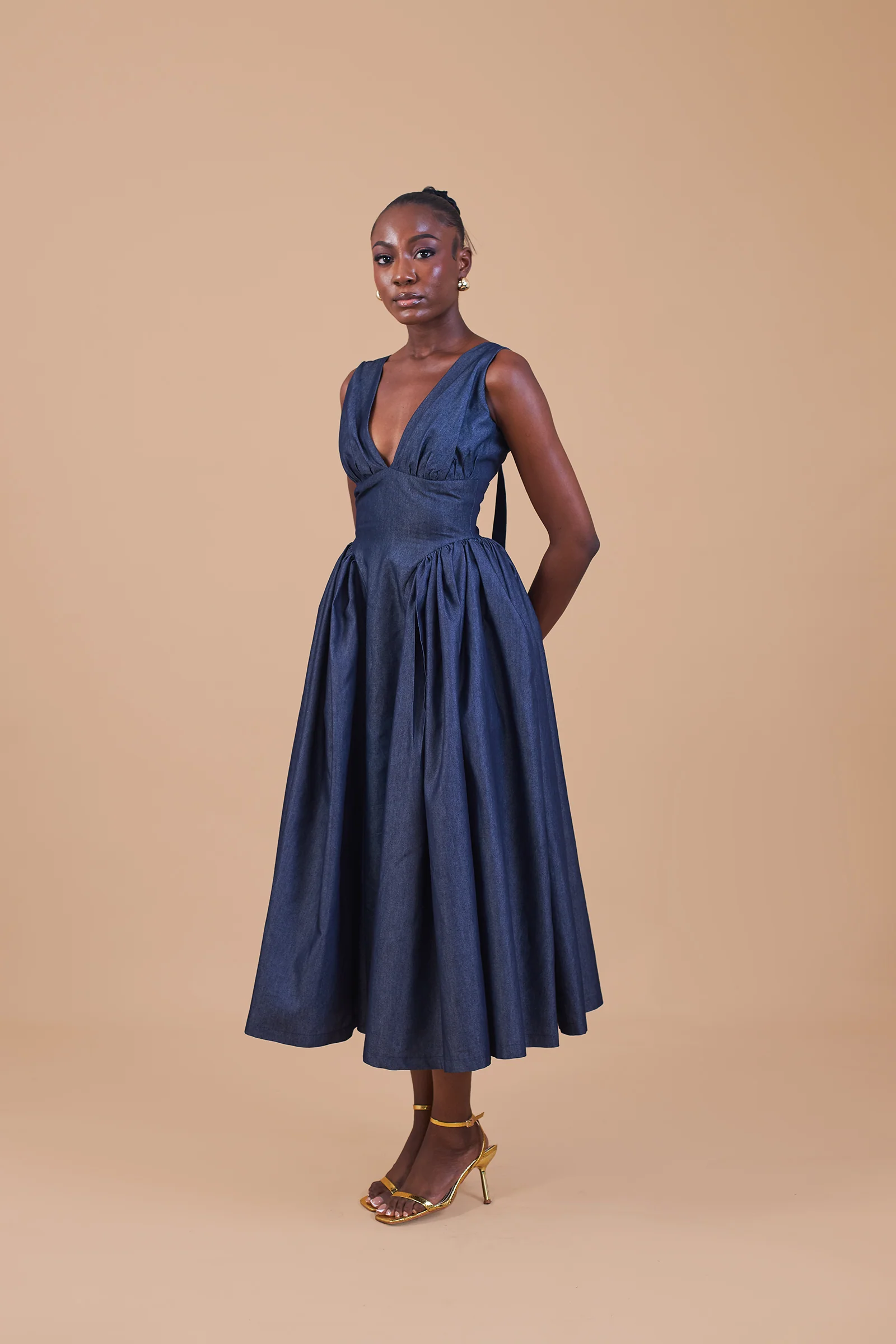 Sleeveless midi dress with deep V-neckline, tie-back detail and gathered side panels